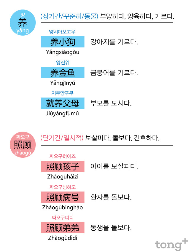 중국어에는 비슷하지만 미묘한 차이를 가진 단어가 많다. 养(yǎng,양)과 照顾(zhàogù,짜오구)는 모두 무언가를 돌본다는 뜻이 있지만, 养은 자식이나 연로한 부모님 등 장기간 책임지고 보살핀다는 의미를 지니며, 照顾는 병간호를 하거나 조카를 잠시 돌보는 등 단기간, 일시적인 돌봄을 뜻한다.