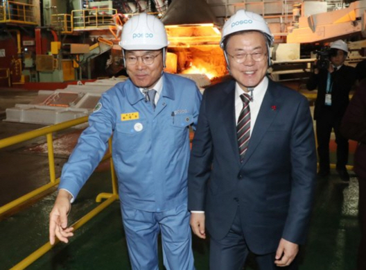 문재인 대통령이 새해 첫 기업 현장방문으로 국내 유일의 ‘등대공장’인 포스코의 포항제철소를 선택했다. 문 대통령과 박영선 중소벤처기업부 장관은 9일 최정우 포스코 회장과 임직원들의 안내를 받으며 포항제철소의 첨단 스마트팩토리와 중소기업 상생협력 현장을 둘러봤다.