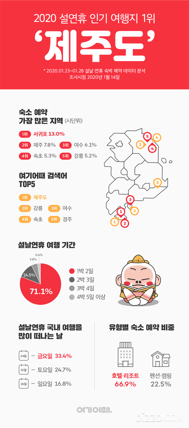 여기어때의 숙소 예약 데이터에 따르면, 설날 연휴 기간 숙소 예약이 가장 많은 지역은 제주도다. 전체 예약 중 서귀포는 13.0%, 제주는 7.8%로, 국내 여행객 10명 중 2명 이상은 제주도를 방문한다. 여기어때 앱에서 검색한 여행지 순위에서도 제주도가 1위를 차지했다. 조사 대상은 이달 14일 기준, 23 ~28일 숙박하는 예약 건수다.