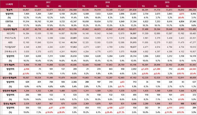 LG화학 최고재무책임자(CFO) 차동석 부사장은 "연간으로는 미·중 무역분쟁, 글로벌 경기 둔화 등에도 전지사업의 지속적인 성장세로 사상 최대 매출을 달성했으나, ESS 관련 일회성 비용의 영향으로 전사 이익 규모가 축소됐다"며 "특히 4분기는 일회성 비용이 반영되며 영업이익이 적자 전환했으나, 석유화학부문의 계절적 비수기 및 시황 악화에도 견조한 수익성 유지, 전지부문의 자동차전지 손익분기점(BEP)에 준하는 실적 달성 등의 의미 있는 성과도 있었다”고 설명했다.