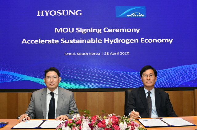 효성은 산업용 가스 전문 세계적 화학기업인 린데그룹과 함께 오는 2022년까지 총 3000억원을 투자해 액화수소 생산, 운송 및 충전시설 설치와 운영을 망라하는 밸류체인을 구축하기로 했다고 28일 밝혔다. 이를 위해 이날 서울 마포 본사에서 조현준 효성 회장과 성백석 린데코리아 회장이 참석한 가운데 MOU를 체결했다.