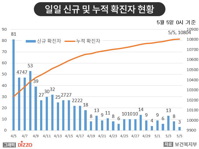 질병관리본부 중앙방역대책본부(이하 중대본)는 5월 5일 0시 현재, 총 누적 확진자 수는 10,804명(해외유입 1,102명, 내국인 90.5%)이며, 이 중 9,283명(85.9%)이 격리 해제되었다고 밝혔다. 신규 확진자는 3명이고, 격리 해제는 66명 증가해 전체적으로 격리 중 환자는 감소했다. 코로나19 관련 사망자는 2명 추가되어 총 254명이며, 재양성자는 총 353명이다.