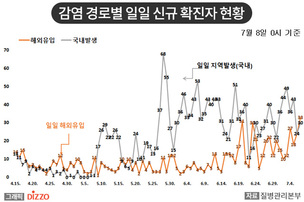 질병관리본부 중앙방역대책본부는 7월 8일 0시 현재, 국내발생은 30명, 해외유입으로 33명의 신규 확진자가 발생하여 총 누적 확진자수는 13,244명(해외유입 1,747명)이라고 밝혔다. 신규 격리해제자는 56명으로 총 11,970명(90.4%)이 격리해제 되어, 현재 989명이 격리 중이다. 사망자는 0명으로 누적 사망자는 285명(치명률 2.15%)이다.