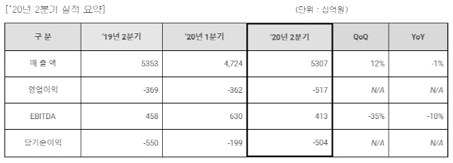 당기순손실은 5038억원, EBITDA는 4125억원(EBITDA 이익률 7.8%)를 기록했다.