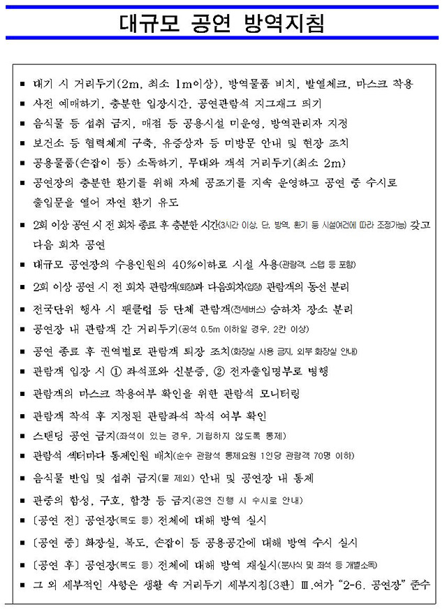 이번 공연은 송파구청의 ‘대규모 공연 방역’ 지침을 준수하기 위해 플로어석은 한 자리 띄어 앉기, 1층과 2층 석은 두 자리 띄어 앉기로 전체적인 관람객 수를 줄이고 각 회차의 관객이 겹치는 동선을 최소화하기 위해 오후 2시와 7시였던 공연 시간을 오후 1시와 7시 30분으로 변경하는 등 방역 대책에 대해 추가 보완하여 진행한다.