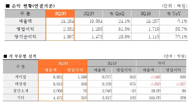사업별로 보면 케미칼 부문은 매출이 전년 동기 대비 2.7% 감소한 8831억원, 영업이익이 66.8% 증가한 1588억원을 기록했다. 국제 유가 하락에 따른 저가 원료 투입 효과가 지속된데다, 코로나19 여파로 일회용품 수요가 늘면서 PVC(폴리염화비닐), PO(폴리올레핀) 제품 가격이 상승했기 때문이다.