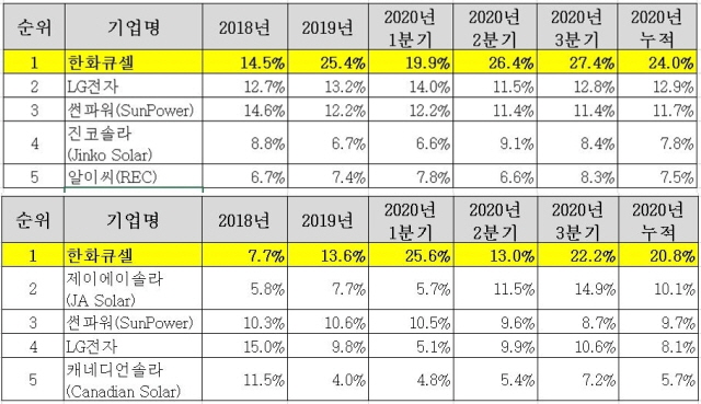 최근 글로벌 에너지 컨설팅 기관인 우드맥킨지가 발표한 조사 결과에 따르면 한화큐셀은 미국 주거용 태양광 모듈 시장에서 3분기 27.4%의 점유율을 기록하며 9분기 연속 1위를 달성했다. 또한 미국 상업용 태양광 모듈 시장에서는 3분기 시장 점유율 22.2%로 4분기 연속 1위를 유지했다.