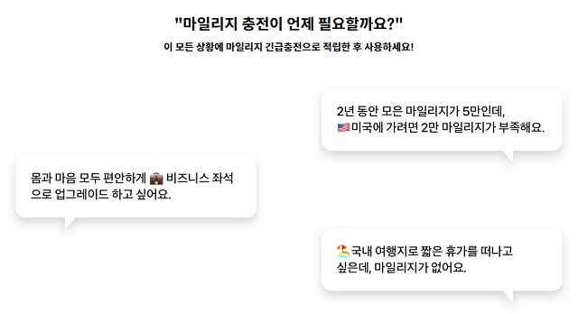 아울러 필요한 마일리지를 먼저 충전해 사용하고 대한항공카드를 통해 적립한 마일리지로 갚을 수 있는 '마일리지 긴급충전 서비스'도 제공한다. 1만, 2만 마일리지 중 선택해 충전할 수 있다.