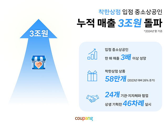 쿠팡의 '착한상점'에 입점한 중소상공인들의 누적 매출이 3조원을 넘어섰다고 4일 밝혔다. 경기 침체와 판로 채널 위축 속에서도 쿠팡을 통해 성장세를 이어가고 있다는 평가다.