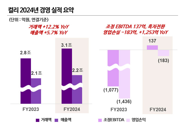 컬리가 이날 진행한 2024년 경영실적 어닝스콜에 따르면, 지난해 연결기준 매출은 전년 대비 6% 증가한 2조1956억원을 기록했다. 영업손실은 1253억원 줄어든 183억원, 조정 EBITDA는 1214억원 개선된 137억원으로 나타났다. 같은 기간 전체 거래액(GMV)은 12% 증가한 3조1148억원을 달성했다.