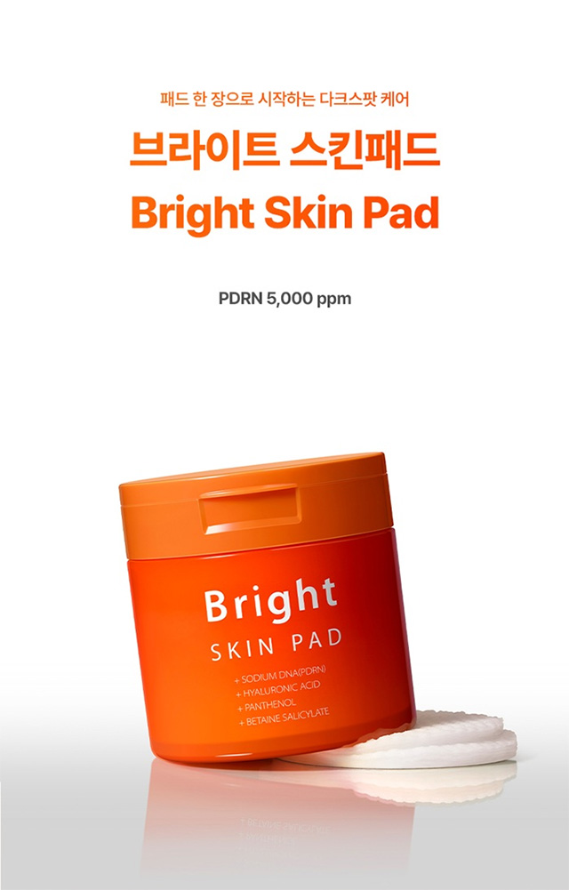 브라이트 스킨패드는 PDRN 5,000ppm과 히알루론산 1,000ppm을 함유했으며, 피지·각질·유분 관리와 피부 진정에 초점을 맞춘 데일리 스킨케어 제품이다. 나이아신아마이드, PHA, 판테놀 등의 성분이 함유되어 있으며, 미백 및 주름 개선 기능성 화장품으로 등록되어 있다. 양면 패드로 구성돼, 클렌징 후 정돈용 또는 집중 부위 팩으로 활용이 가능하다.