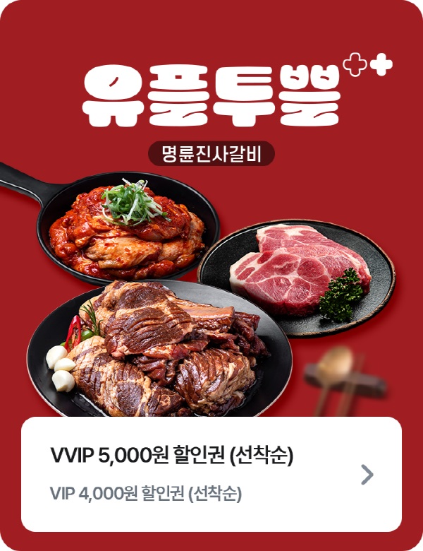 할인 쿠폰은 4월 22일 단 하루, 오전 11시부터 오후 11시 59분까지 LG유플러스 멤버십 앱 내 ‘유플투쁠’ 페이지에서 선착순으로 다운로드가 가능하며, VVIP 회원은 명륜진사갈비 5천 원 할인권, VIP 회원은 명륜진사갈비 4천 원 할인권이 제공된다.