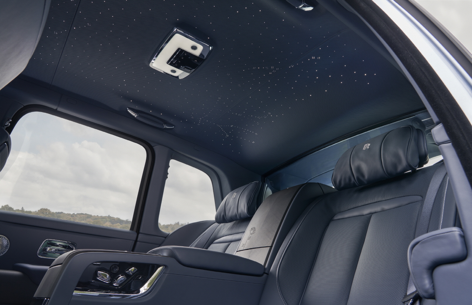 실내에 사용된 블랙우드 베니어는 플리트 블루를 주 색상으로 셀비 그레이와 검정 가죽이 조화를 이루는 3색 인테리어 팔레트와 절묘하게 어우러진다. 시트 파이핑은 플리트 블루, 좌석 헤드레스트의 자수와 스티치는 셀비 그레이 색상으로 마감했으며, 데이지가 새겨진 비스포크 일루미네이티드 트레드플레이트를 탑재해 인테리어의 완성도를 높였다.