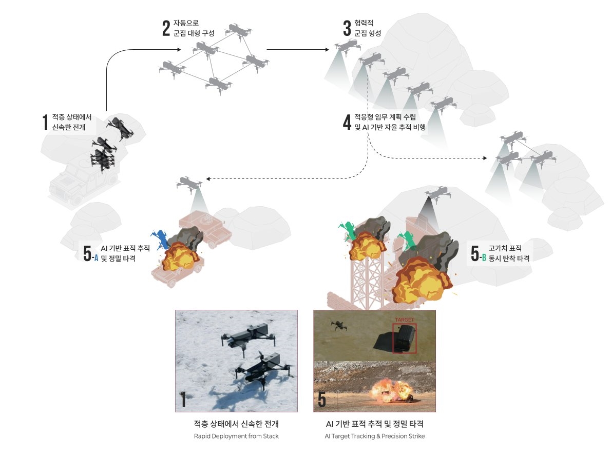 “표적이 설정되어 선도기에 이륙을 지시하면 이륙 준비 후 5초 간격으로 10대의 드론이 모두 이륙해 군집 대형을 형성한다. 즉, 1개 편대의 군집 대형 형성까지는 1분가량 소요된다.”