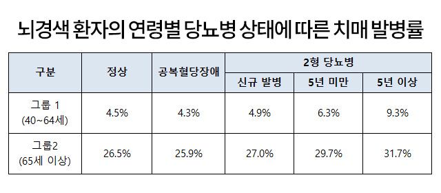 한림대학교성심병원 신경과 이민우 교수팀의 연구 결과에 따르면, 뇌경색 환자는 당뇨병을 오래 앓을수록 치매 발생 위험이 커지는 것으로 나타났다. 그중에서도 비교적 젊은 연령대에서 당뇨병 지속 기간에 따른 치매 위험 상승이 더욱 뚜렷했다.