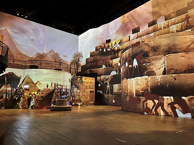 전시 중반부에서는 고대 건축물의 상징인 피라미드가 등장한다. 석재 블록이 하나씩 쌓이며 구조가 완성되는 과정을 보여주는 장면은 독립된 시퀀스로 구성돼 시선을 끌었다. 이어 스핑크스, 신전, 무덤, 거대 조각상 등 상징적 유물들을 연계해 배치했다.