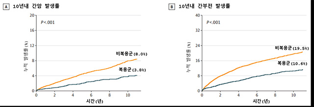 그 결과, 스타틴을 복용한 3,610명의 10년 내 간암 발생률은 3.8%로, 복용하지 않은 12,891명 그룹의 8.0%보다 절반 이상 낮았다. 간 기능 악화를 의미하는 간부전 발생률 역시 스타틴 복용군은 10.6%였으며, 비복용군은 19.5%에 달해 유의미한 차이를 보였다.