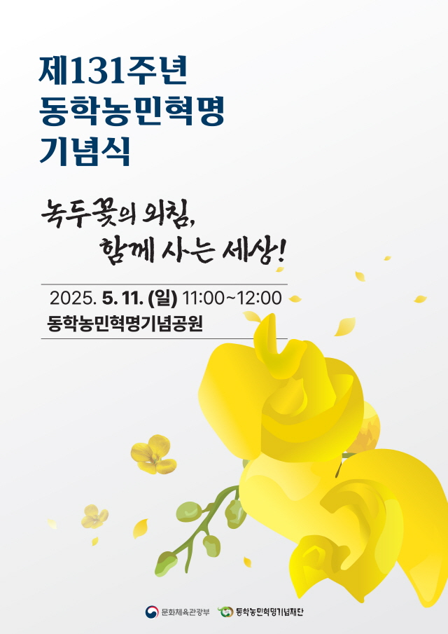 ‘제131주년 동학농민혁명기념식’이 5월 11일 오전 11시, 전북 정읍시 동학농민혁명기념공원에서 개최된다. 문화체육관광부(장관 유인촌) 주최, 동학농민혁명기념재단(이사장 신순철) 주관으로 열리는 이번 기념식은 ‘녹두꽃의 외침, 함께 사는 세상’을 주제로, 동학농민혁명이라는 역사적 사건의 의미를 되새기고 그 정신을 현대 사회에 되살리는 자리로 기획됐다.