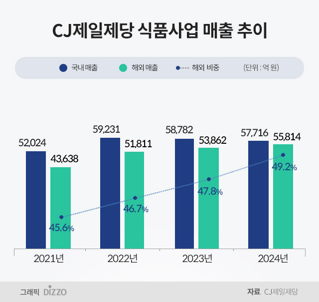 CJ제일제당은 대표 브랜드 비비고를 앞세워 글로벌 식품 시장에서 빠르게 성장하고 있다. 2021년 9조5662억원이었던 식품 부문 매출은 2024년 11조3530억원으로 증가했고, 같은 기간 해외 매출은 28% 성장해 4조3638억원에서 5조5814억원으로 늘었다. 해외 매출 비중도 45.6%에서 49.2%로 상승하며 전체 매출의 절반 수준으로 올라섰다.