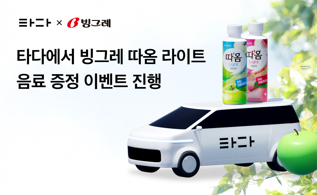 타다 운영사 브이씨엔씨(이하 타다)가 빙그레와 협업해 타다 넥스트 이용 고객에게 과일 음료를 증정하는 이벤트 '타다로 갓따옴'을 진행한다고 13일 밝혔다.