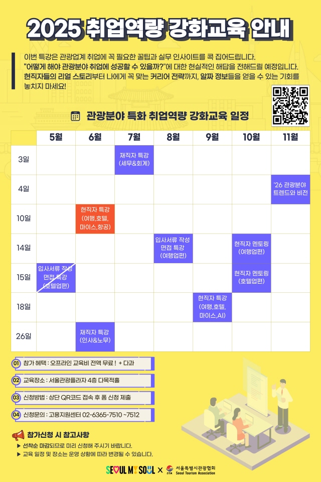 서울특별시관광협회에서 운영하는 서울관광고용지원센터가 오는 6월 10일 관광산업 분야 취업을 준비하는 구직자들을 위한 ‘현직자 취업역량강화 특강’을 마련한다.