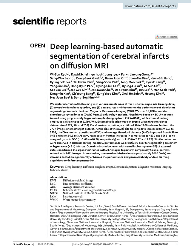 이번 연구 결과는 SCI(E) 등재 국제 학술지인 네이처 자매지 Scientific Reports에 ‘Deep learning-based automatic segmentation of cerebral infarcts on diffusion MRI’라는 제목으로 게재됐다.