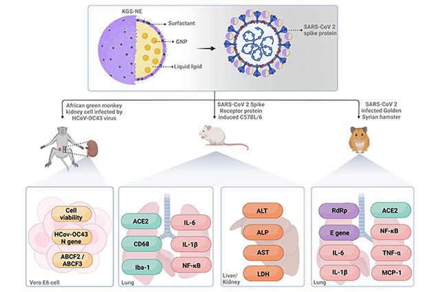 경희대학교 생명과학대학 김연주 교수와 한의과대학 조익현 교수 공동 연구팀은 인삼 종자유와 금 나노입자를 활용한 나노소재 복합체(KGS-NE)를 개발하고, 이를 동물모델에 적용한 결과 코로나19 감염 억제 및 폐 염증 완화 효과를 확인했다고 26일 밝혔다.