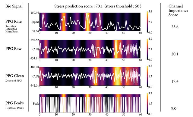 연구팀은 피부 전도도(EDA), 맥파(PPG) 등에서 추출한 특성(feature)을 딥러닝 모델에 함께 투입해 예측 성능을 높였다. 특히 단순히 heatmap을 활용한 시각화가 아니라, 특정 시간대에 어떤 신호가 스트레스 판별에 영향을 미쳤는지를 수치화하고 시각적으로 표현할 수 있도록 설계했다.