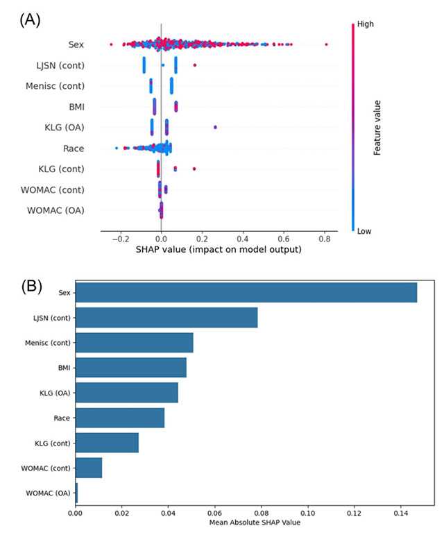SHAP 분석 결과, 예측에 가장 큰 영향을 미친 변수는 성별이었으며, 외측 관절 간격 감소가 그다음으로 영향을 미쳤다. 특히 외측 관절 간격이 줄어든 경우, 반대쪽 무릎에서 관절염이 발생할 위험이 약 4.5배(odds ratio 4.475) 증가하는 것으로 분석됐다. 또한 이번 연구에서는 기존 관절염 무릎의 KLG나 WOMAC 점수가 반대쪽 무릎의 관절염 발생과도 유의미한 연관을 보인 것으로 처음 확인됐다.