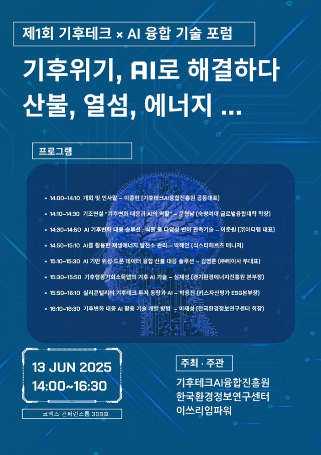 ‘기후테크×AI 융합 기술 포럼’은 6월 13일 오후 2시부터 4시 30분까지, 서울 코엑스 컨퍼런스룸 308호에서 개최된다. 본 포럼은 기후테크AI융합진흥원이 주최하고, 한국환경정보연구센터(KERIC)와 이쓰리임파워가 공동 주관하며, 지속가능과학회, AVPN 한국대표부가 후원한다. 기후 관련 산업계, 스타트업, 연구기관, 공공기관 등이 참여해 AI와 기후기술의 융합 가능성을 종합적으로 논의한다.