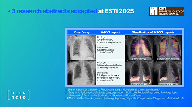 의료 AI 기업 딥노이드(대표 최우식)는 흉부 엑스레이(CXR) 영상에서 생성형 AI를 활용해 소견서 초안을 작성하는 모델 ‘M4CXR’에 대한 연구 초록 3편이 유럽흉부영상의학회(ESTI) 2025에서 채택됐다고 10일 밝혔다. 해당 연구는 부산대학교병원 정연주 교수 연구팀이 주도했으며, 오는 6월 12일부터 14일까지 노르웨이 베르겐에서 열리는 ESTI 학술대회에서 구연 및 포스터 발표할 예정이다.