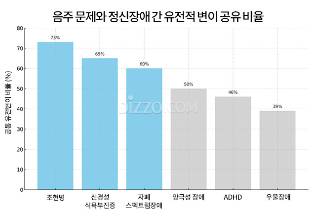 분석 결과, 음주 문제는 조현병(73%), 신경성 식욕부진증(65%), 자폐스펙트럼장애(60%) 등 대표적인 정신질환과 높은 수준의 공통 유전변이를 공유하는 것으로 나타났다. 이는 두 질환이 단순히 환경적 요인에 의한 동반 질환이 아닌, 유전적으로 연관된 복합 질환일 수 있음을 시사한다.