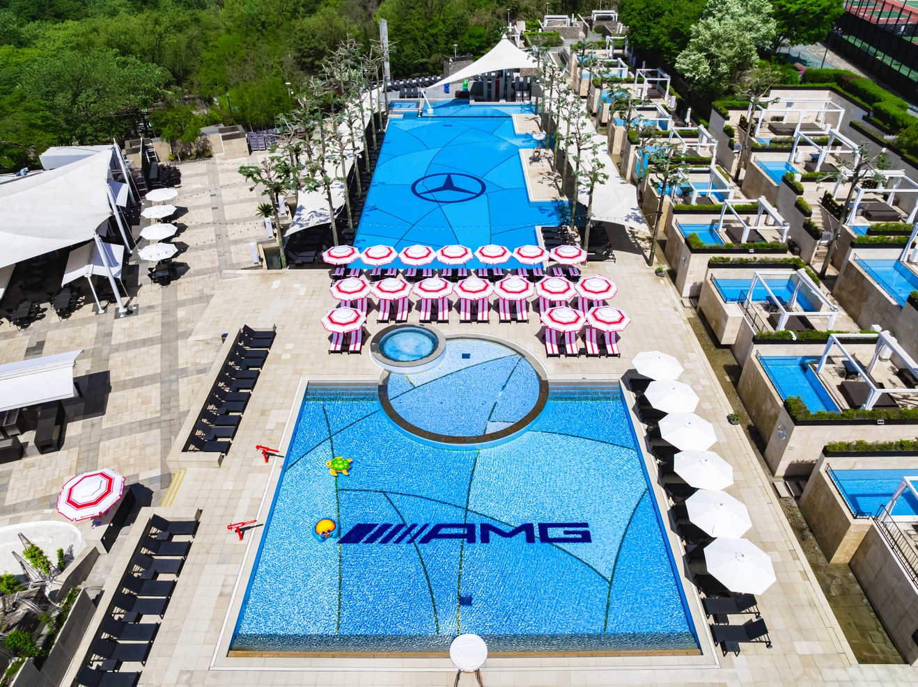 오아시스 야외 수영장 바닥에는 대형 삼각별과 AMG 로고 그래픽을 선명하게 입혀, 청량한 분위기 속에서 압도적인 존재감을 발휘한다. 여기에 브랜드 컬러를 반영한 전용 파라솔과 선베드, 감각적인 포토존과 키즈존 등 곳곳에 AMG의 강렬한 존재감을 더해, 반얀트리 서울 오아시스 야외 수영장을 찾는 고객이 오감으로 브랜드를 체험할 수 있는 몰입형 공간으로 완성했다.