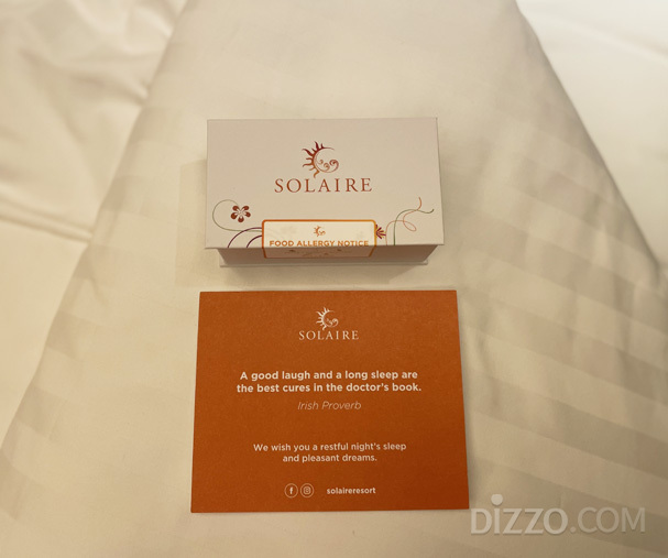 매일 저녁 객실에 제공되는 턴다운 서비스는 솔레어 리조트 노스만의 특별한 환대를 보여주는 대표적인 서비스다. 객실로 돌아오면 침대에 작은 선물과 함께 따뜻한 메시지가 놓여 있다.