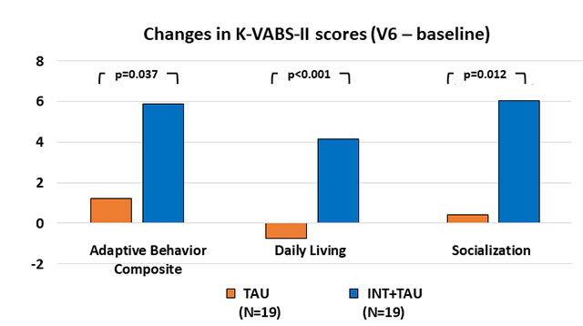 그 결과, 모바일 게임 병행 그룹이 전반적으로 더 큰 개선 폭을 보였다. 적응행동 조합 점수는 모바일 게임 병행 그룹에서 5.89점 상승했지만, 기존 치료 그룹은 1.21점 증가에 그쳤다. 사회성 점수는 모바일 게임 병행 그룹이 6.05점 올랐고, 기존 치료 그룹은 0.42점 상승했다. 일상생활 능력은 모바일 게임 병행 그룹에서 4.16점 증가했으나, 기존 치료 그룹은 0.74점 감소했다. 반복적 행동은 모바일 게임 병행 그룹에서 9.11점 감소해 기존 치료 그룹의 2.89점 감소보다 현저히 큰 차이를 보였다.