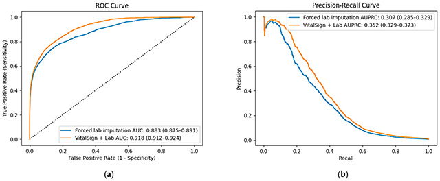 바이탈케어 AI의 결측치 처리 방식과 평균 대치법(Mean Imputation), MICE(Multiple Imputation by Chained Equations) 다중 대체법의 예측 성능을 비교한 결과, 바이탈케어 AI는 AUROC(곡선하면적) 0.896을 기록해 평균 대치법(0.885)과 MICE(0.827)보다 높은 예측력을 보였다. 기존 대치법들이 결측 데이터에 숨겨진 ‘정보성 존재(Informative Presence)’를 반영하지 못해 성능 차이가 발생한 것으로 분석됐다.