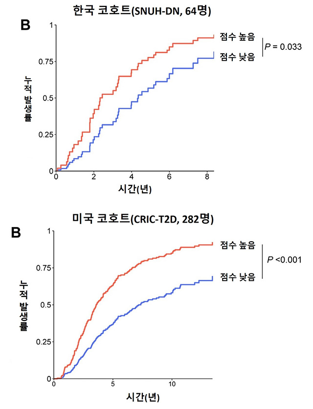 연구팀은 당뇨병으로 인한 신장 손상이 명확히 진단된 한국 환자 64명을 대상으로 소변 단백질을 정밀 분석하고, 군집별 발현 경향을 비교했다. 이후 미국의 다인종 만성콩팥병 코호트(CRIC)에 속한 282명의 환자에게도 같은 방식으로 재검증을 실시해 일관된 결과를 확인했다. 이어 소변 속 보체 단백질의 발현 수준을 수치화한 ‘보체 점수’를 개발하고, 다수의 보체 단백질 발현량을 조합해 점수화하는 방식으로 ‘보체 점수’를 산출해 환자의 질환 진행 속도와 비교했다.