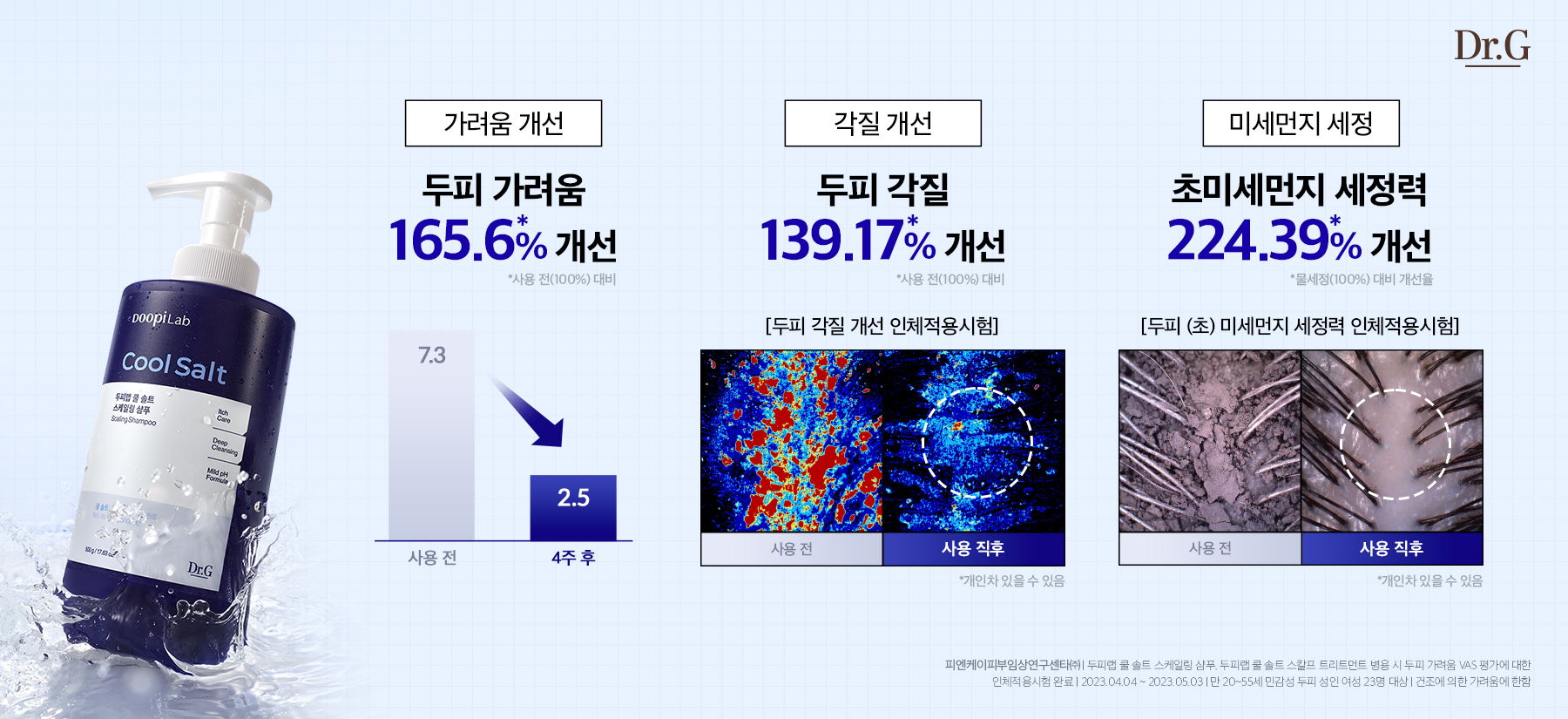“기존 스케일링 제품은 대부분 고체 형태의 스크럽 제품으로 반복해서 사용하면 물리적 자극을 유발해, 민감한 두피에는 부담이 될 수 있었다. 이는 장벽 손상, 모세혈관 자극, 만성 염증까지 유발할 수 있어 주의가 필요한 것이 사실이었다. 닥터지는 이러한 자극 문제를 해결하기 위해, 얼굴에 사용하는 저자극 필링젤에서 착안해 민감한 두피에도 자극 걱정 없이 사용할 수 있는 새로운 스케일링 제형을 연구했다. 그렇게 개발된 것이 액상 소금 기반으로 자극을 최소화한 독자 특허 원료 ‘쿨 솔트(Cool Salt)’다.”