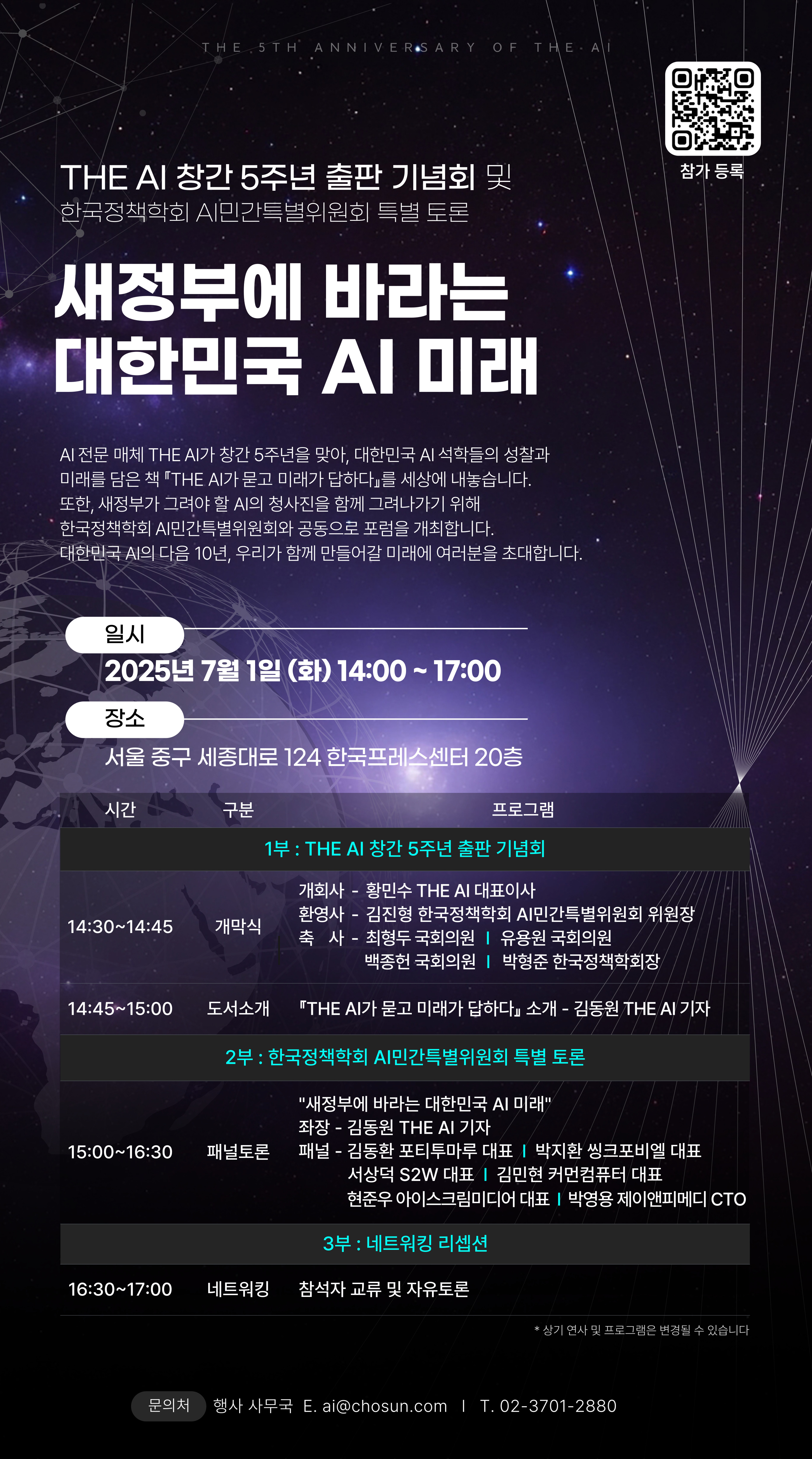 AI 기술 발전과 정책 동향에 관심 있는 관련 업계 종사자와 연구자들의 참여가 예상되는 이번 행사는 새정부 출범 이후 AI 분야의 정책 방향과 민간의 기대 사항을 논의하는 자리가 될 전망이다. 참가 등록은 행사 사무국(링크)을 통해 가능하다.