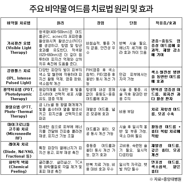 중앙대광명병원 한혜성 교수는 “비약물 치료 기술은 빠르게 발전하고 있으며, 여드름뿐만 아니라 흉터, 색소침착 등 이차적인 피부 변화까지 함께 개선할 수 있다는 점에서 임상 활용 가치가 크다”고 말했다.