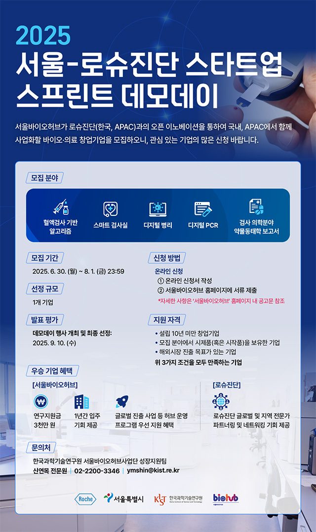서울시 산하 바이오·의료 창업지원 플랫폼 서울바이오허브가 글로벌 진단기업 로슈진단(한국·APAC)과 함께 ‘2025 스타트업 스프린트 데모데이’ 참여기업을 모집한다고 14일 밝혔다.