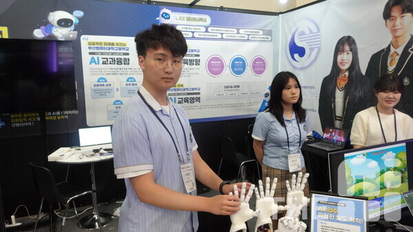 부산컴퓨터과학고 학생들은 3D프린터와 아두이노로 제작한 ‘AI 의수’를 선보였다. 사용자가 컴퓨터 카메라 앞에서 손을 움직이면 로봇팔이 그대로 따라 한다. 이재형 부산컴퓨터과학고 학생은 “위험하거나 사람이 접근하기 힘든 작업을 대신할 수 있도록 개발했다”며 “학교에서 친구들과 함께 직접 설계하고 프로그래밍했다”고 소개했다.