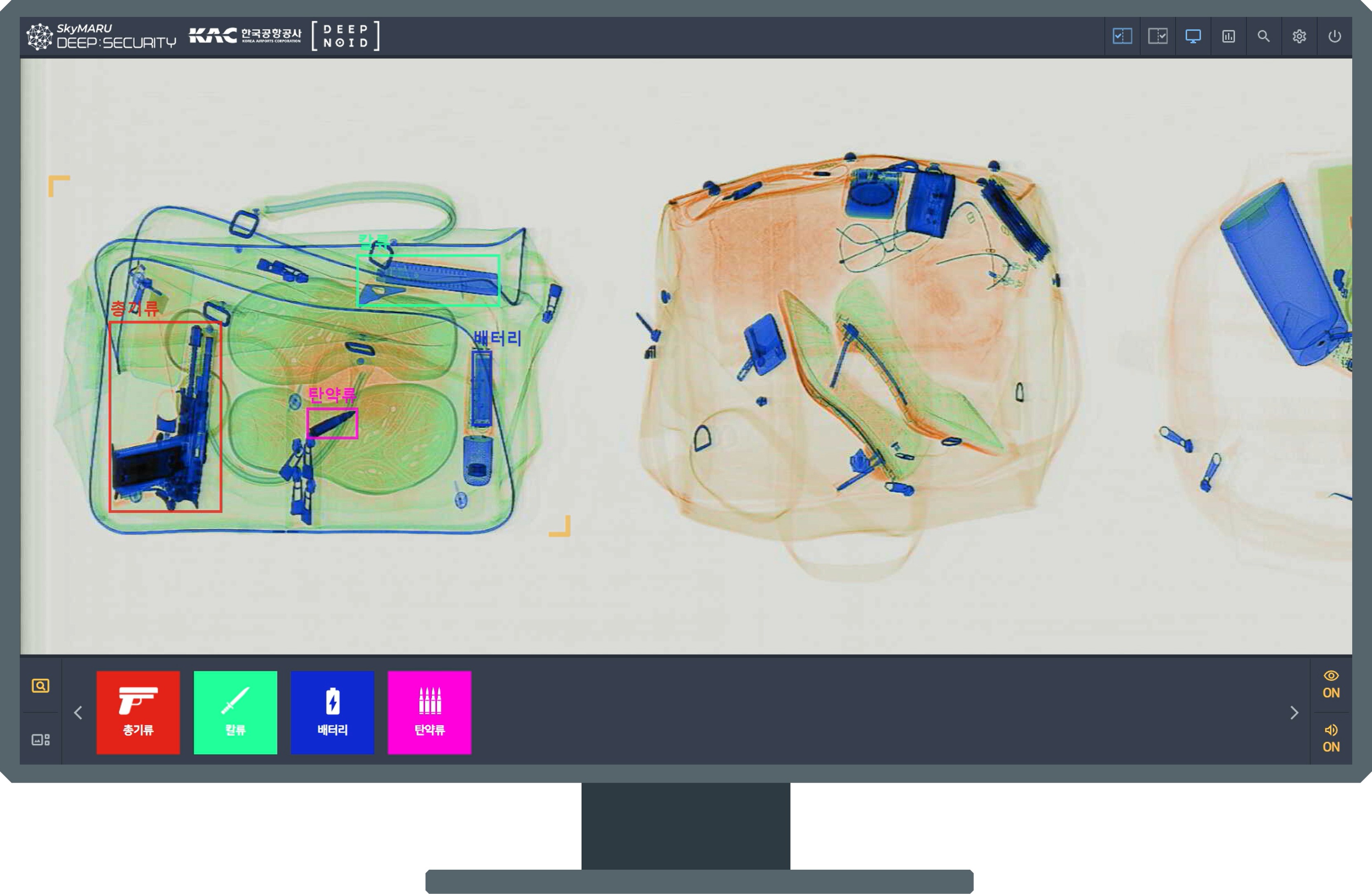 이 솔루션은 양방향 X-ray 검색 장비와 연동되어 총기류, 폭발물 등 26종의 위험 물품을 탐지하고, 자동 알림 기능을 통해 보안 요원의 판독을 지원한다.