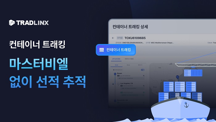 이번 서비스는 TRADLINX Ocean Visibility 플랫폼 내 컨테이너 트래킹 메뉴에서 컨테이너 번호, 관리 번호, 선사 코드만 입력하면 즉시 화물 추적을 확인할 수 있도록 지원한다. 이후 수출입 전 과정에서 실시간 화물 위치 및 상태를 확인이 가능하다.