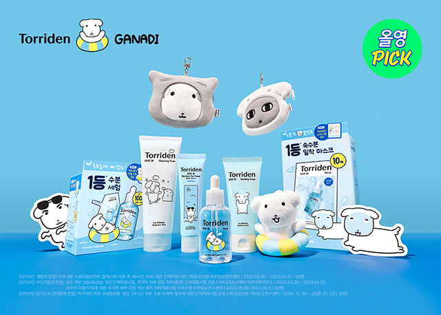 컨셔스 뷰티 브랜드 토리든이 캐릭터 IP 가나디와 협업한 다이브인 라인 한정 기획세트를 8월 한 달간 올리브영 온·오프라인 매장에서 판매한다고 1일 밝혔다. 이번 구성은 다이브인 베스트셀러 5종과 제품별 캐릭터 굿즈로 구성됐다.