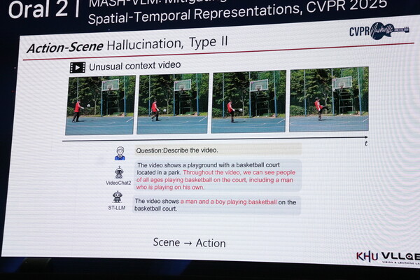 4일 최진우 교수는 부산 벡스코에서 열린 KCCV(Korean Conference on Computer Vision) 2025에서 비전 AI가 영상을 잘못 해석하는 ‘액션-장면 환각(Action-Scene Hallucination)’ 현상을 분석하고, 이 오류의 구조적 원인을 규명하는 동시에 이를 해결하는 새로운 모델 아키텍처를 발표했다.