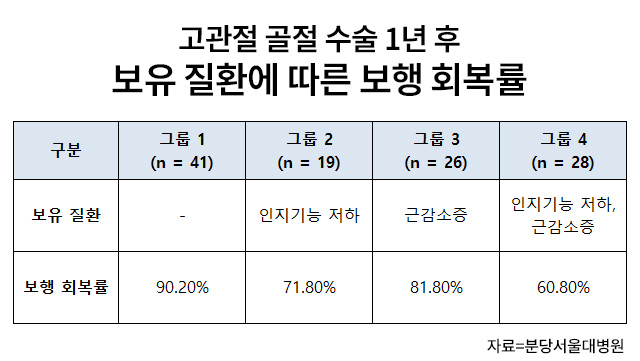 분당서울대병원 재활의학과 임재영 교수와 순천향대천안병원 임승규 교수팀은 고관절 골절 수술을 받은 65세 이상 환자 114명을 대상으로, 인지기능 저하 및 근감소증 유무에 따른 보행 회복률을 분석했다. 연구 결과, 두 질환을 모두 가진 환자군의 보행 회복률은 60.8%로, 질환이 없는 환자군(90.2%) 대비 약 30%p 낮았다.