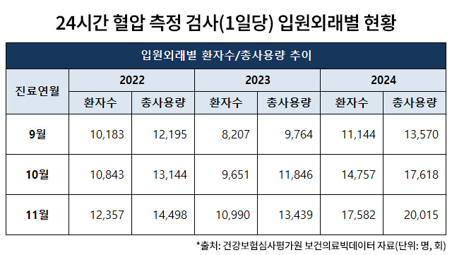 건강보험심사평가원 통계에 따르면 CART BP pro의 급여 적용 직후인 2024년 9월부터 ‘24시간 혈압 측정 검사’ 청구 건수가 큰 폭으로 증가했다. 지난해 9월부터 11월까지 세 달간의 월별 청구 건수는 전년 동기 대비 각각 38.9%, 48.8%, 48.9% 증가했고, 검사 환자 수도 같은 기간 35.7%에서 61.2%까지 늘어난 것으로 나타났다.