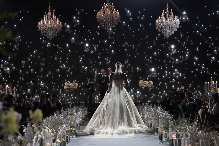 연회장 천장을 수놓은 수천 개의 스팽클 천장 장식은 밤하늘의 끝없이 펼쳐진 별빛처럼 은은하게 반짝이며, 그 빛은 유리처럼 매끄러운 미러로드에 반사되어 마치 별빛을 밟고 걷는 듯한 로맨틱한 순간을 연출한다는 것이 특징이다.