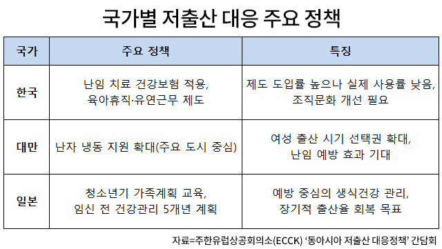 주한유럽상공회의소(ECCK)가 11일 인천 쉐라톤 그랜드 호텔에서 ‘동아시아 저출산 대응 정책(Low Birth Rate Policies in East Asia)’ 간담회를 열고, 한·일·대만 전문가들과 난임 치료, 난자 냉동, 생식건강 교육 등 보건·의료 분야를 포함한 저출산 대응 방안을 논의했다. 이번 행사는 대통령 직속 저출산고령사회위원회 후원과 ECCK의 ‘가족친화미래포럼(FFFF)’ 활동의 하나로 진행됐다.